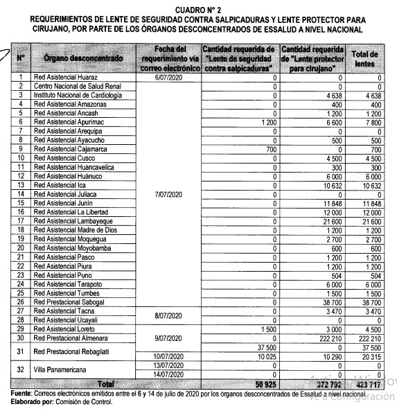 Lo extraño fue que las redes asistenciales de las regiones solo le habían enviado requerimientos para 50 925 de estos lentes. Habían pedido, más bien, 372 792 lentes protectores para cirujano. A pesar de ello, Operaciones Territoriales no solicitó ninguno de estos últimos. En total, los pedidos de las redes asistenciales sumaban alrededor de 423 mil lentes, una cifra bastante más baja que la presentada por la gerencia de Dávila.