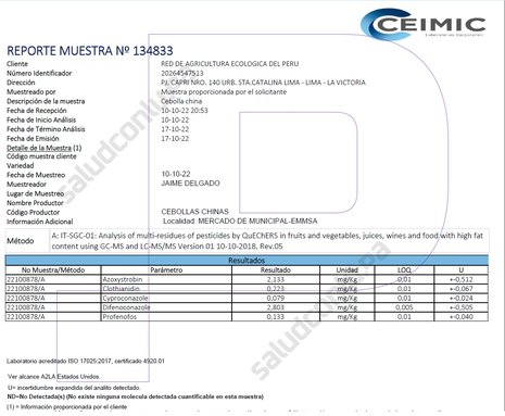 En las últimas semanas, ante las frecuentes quejas en redes sociales sobre de la presencia de manchas azules en la cebollita china que se venden en mercados y supermercados del Perú, decidimos junto a Slow Food, la Red de Agricultura Ecológica RAE y el Consorcio Agroecológico adquirir estos productos tan utilizados en los chifas y en nuestros propios hogares y los enviamos a un laboratorio acreditado para analizarlos.