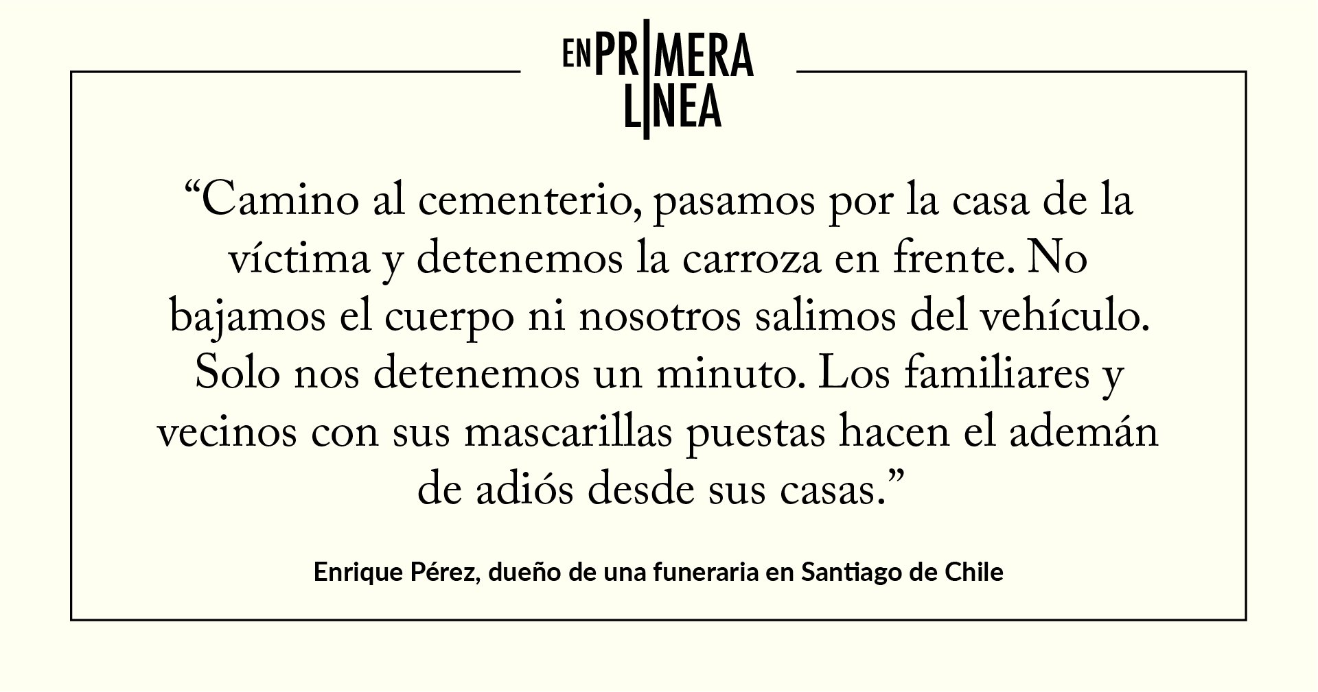 En los veintiocho años que llevo trabajando en la funeraria nunca pensé que iba a vivir algo así. Antes nosotros tomábamos a la persona fallecida y la dejábamos velando en el lugar que la familia estimara conveniente: parroquias, casas, sedes vecinales, iglesias. Por normativas sanitarias, estas ceremonias podían durar un máximo de dos días. Ahora no. Ahora el fallecido va directo a sepultación. Eso es algo muy triste porque, en mi experiencia, el rito funerario ayuda a las personas a soportar el duelo. Por eso, nosotros camino al cementerio, pasamos por la casa de la víctima y detenemos la carroza en frente. No bajamos el cuerpo ni nosotros salimos del vehículo. Solo nos detenemos un minuto. Hacemos una parada de honor, como le llamamos, y después continuamos con el cortejo. Los familiares y vecinos con sus mascarillas puestas hacen el ademán de adiós desde sus casas. Es un homenaje más bien simbólico, un gesto a la distancia.